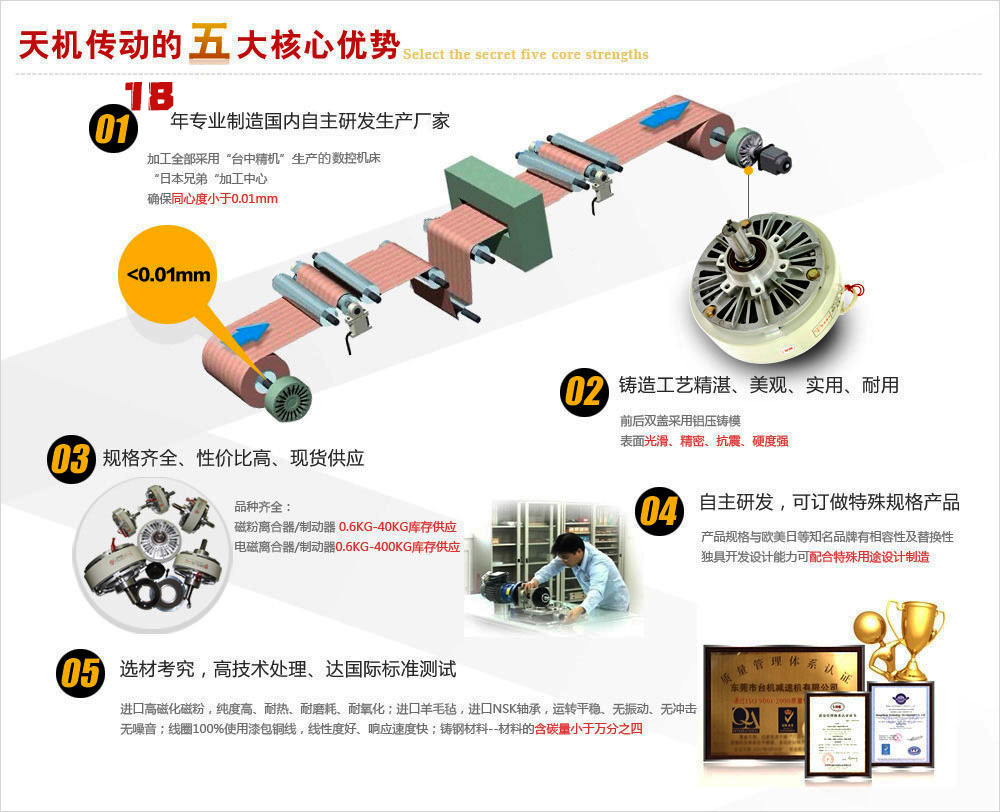 东莞市台机减速机有限公司(天机传动)成立于2005年,专注于研发生产销售磁粉离合器、磁粉制动器及张力控制器等张力控制系统组件及干式电磁离合器、电磁制动器、离合刹车减速机、气胀轴等传动件。产品辐射全国各地,如广州、深圳、温州、上海、北京、苏州、无锡、常州、南通、合肥、厦门、宁波、天津等地区。